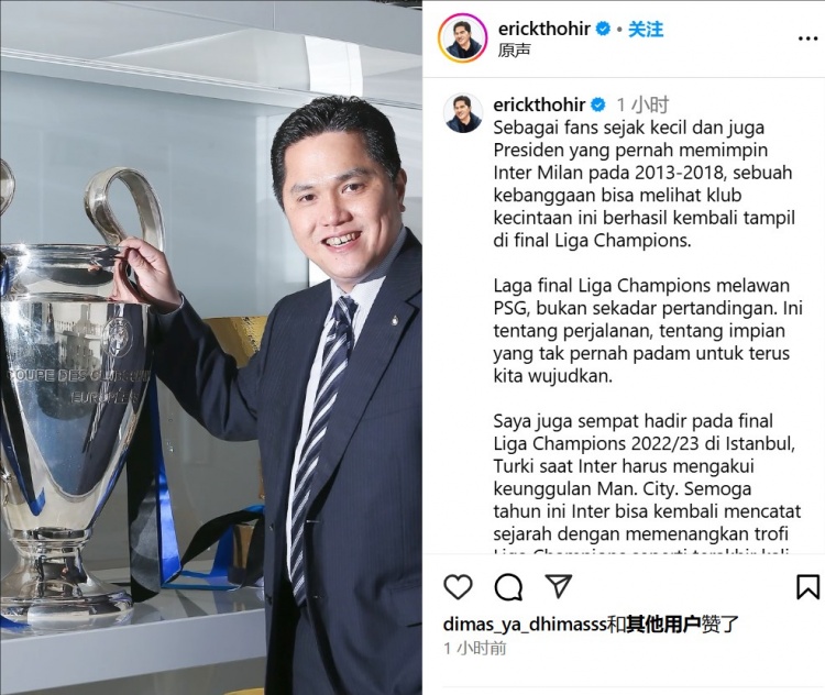 托希尔写道:“作为一名从小就支持国米的球迷,以及在2013年至2018年期间担任俱乐部主席的人,看到这家我深爱的俱乐部再次闯入欧冠决赛、争取胜利,令我感到骄傲。与巴黎的这场欧冠决赛不仅仅是一场比赛,更是一段旅程,是一个永不熄灭、持续实现的梦想。”