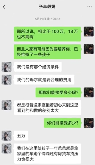 在这段聊天记录中,张卓毅妈妈透露了一系列信息,孩子很优秀,因此赔偿费用高;诉求是以合理的费用换自由身踢校园足球;能接受5万的培训补偿;家里房贷车贷压力也很大。